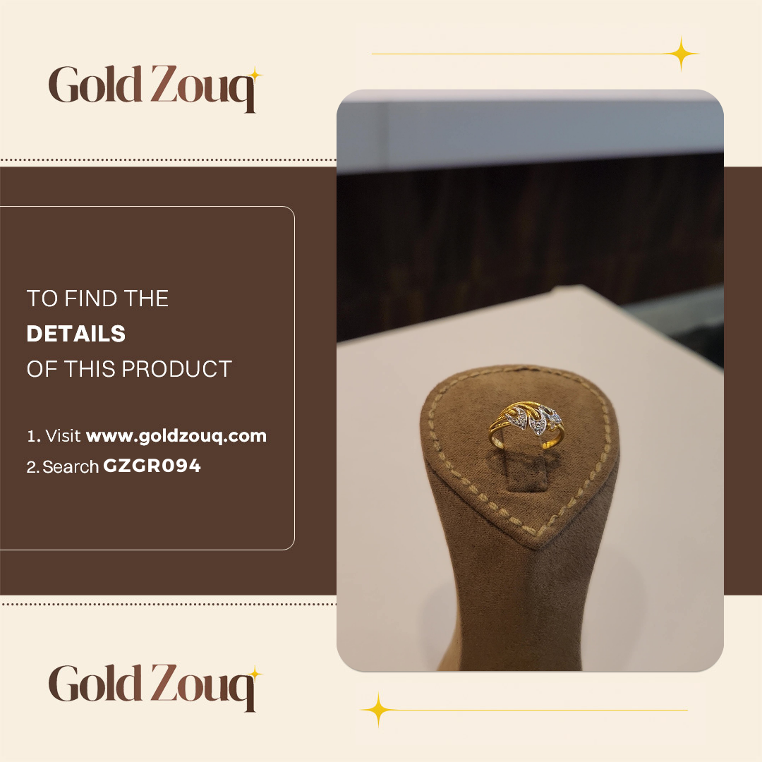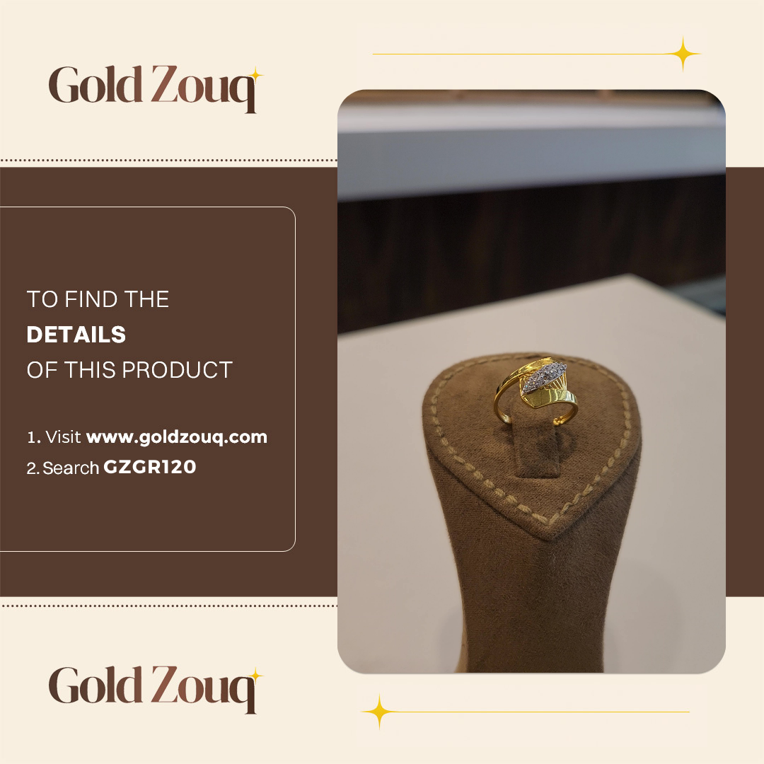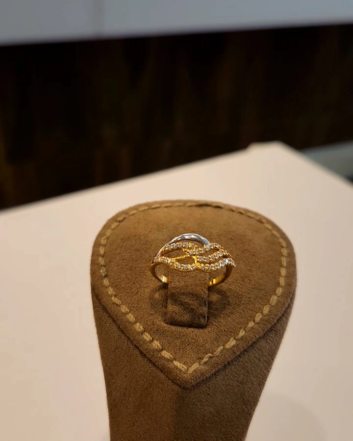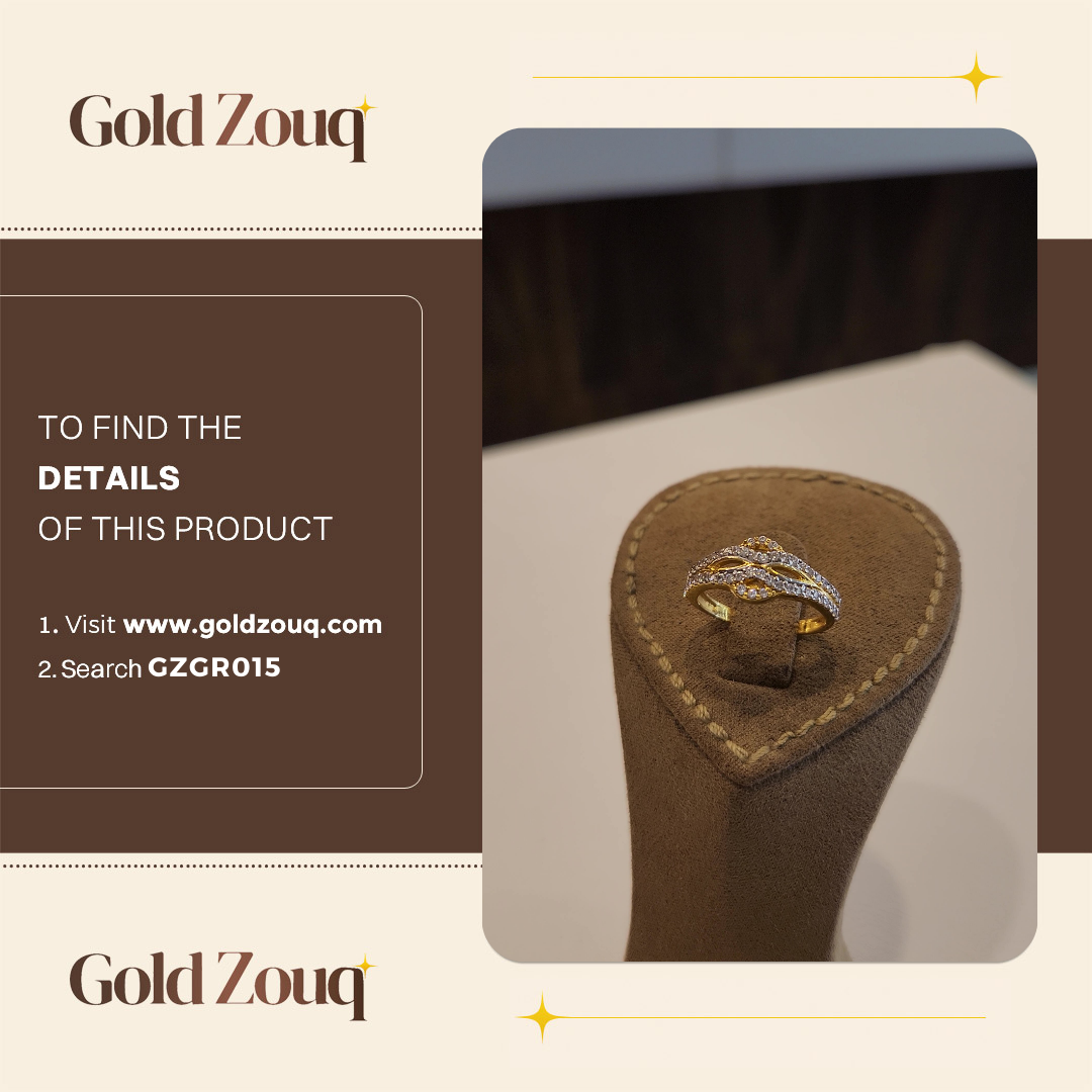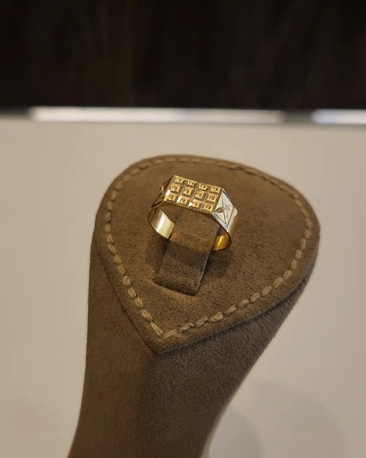 A glamorous and eye-catching gold ring with stones embedded on the band and a geometric shape of two diagonal squares at the top, adding a touch of sophistication and elegance.