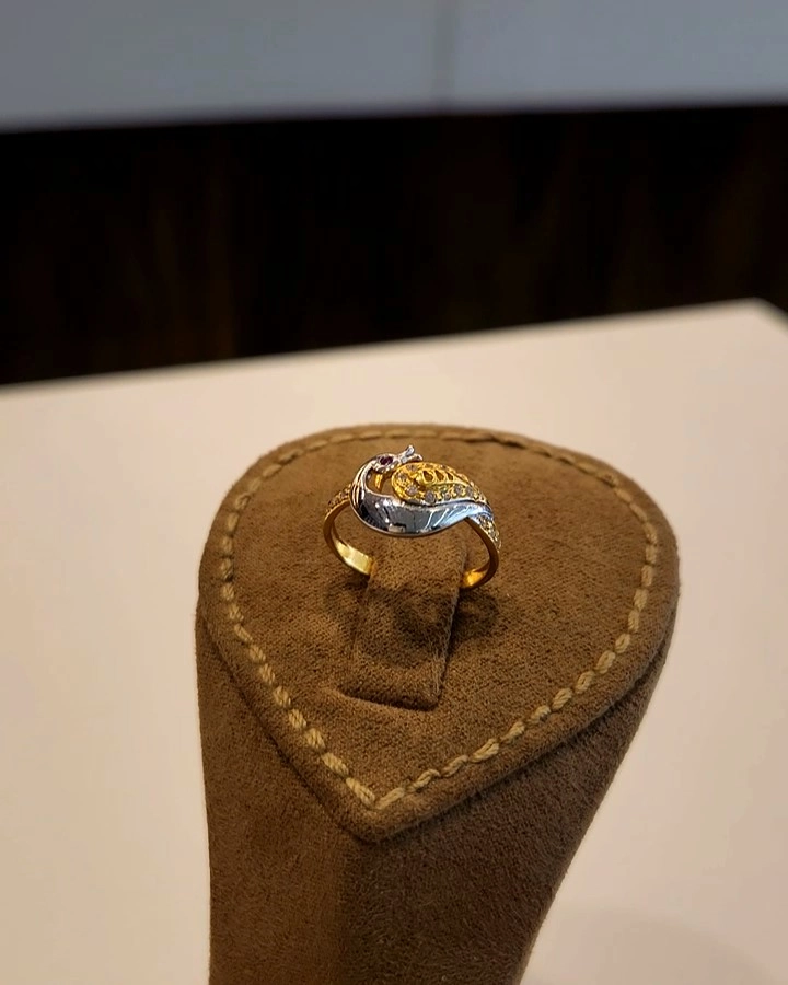 A stunning and regal gold ring with a peacock motif, featuring intricate detailing and a colorful array of gemstones that make a bold and statement-worthy addition to any jewelry collection.
