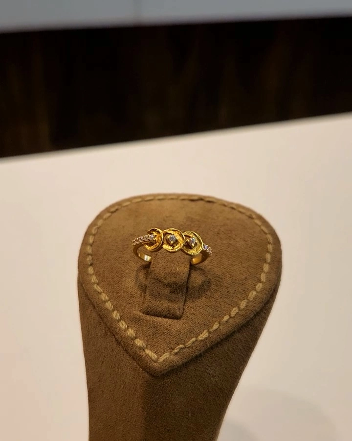 a simple and elegant ring with a thin band and a small golden bloom, great for stacking with other rings or wearing on its own for a subtle touch of glamour.
